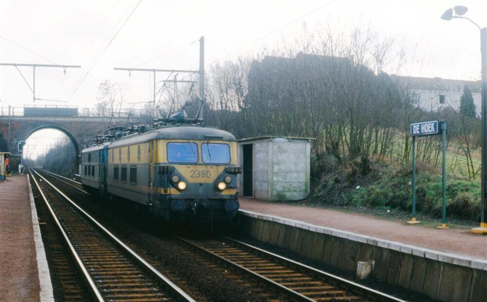 Twee elektrische locomotieven reeks 23 rijden gekoppeld door de halte De Hoek. We zien de perrons, een stationsnaambord en een betonnen schuilhuisje. Links op de achtergrond staat een lichtsein.