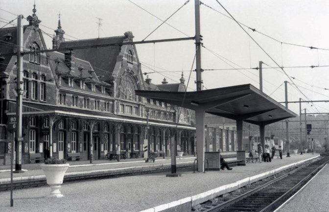 BeschrijvingDeze fotogroep bestaat uit twee negatieven. De foto's tonen de achtergevel van het station in Vlaamse neorenaissancestijl. De perrons zijn van luifels, bloemvazen en zitbanken voorzien. Boven de sporen hangt bovenleiding.