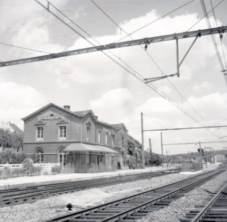 De foto toont de zij- en achtergevel van het station met zijn puntgevels en luifel. Op het gelijkvloers zijn de ramen en deuren met een rondboog uitgevoerd. De afsluiting van het spoorwegdomein bestaat uit betonnen elementen. Boven de sporen hangt een compoundbovenleiding. Deze zorgt bij hoge snelheden voor een goede stroomafname door de locomotief.