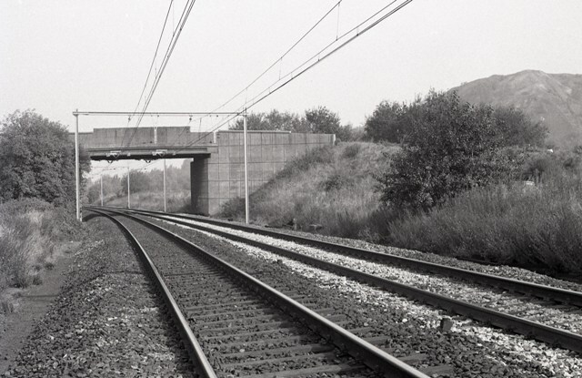 BeschrijvingEen betonnen brug in de buurt van Cuesmes overspant twee geëlektrificeerde sporen.