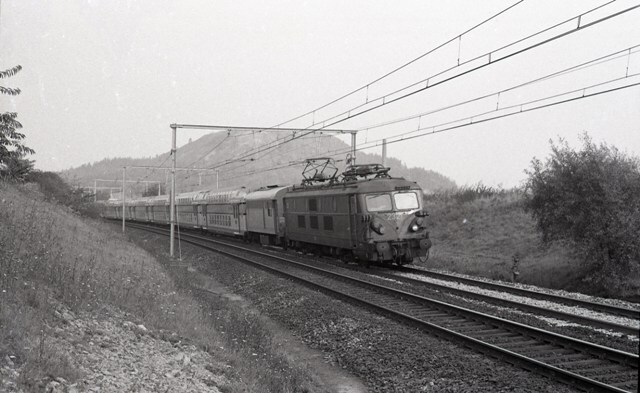Elektrische locomotief 2321 rijdt met een internationale reizigerstrein in de omgeving van Cuesmes. De sleep bestaat uit een pakwagen en dubbeldekrijtuigen van de SNCF.