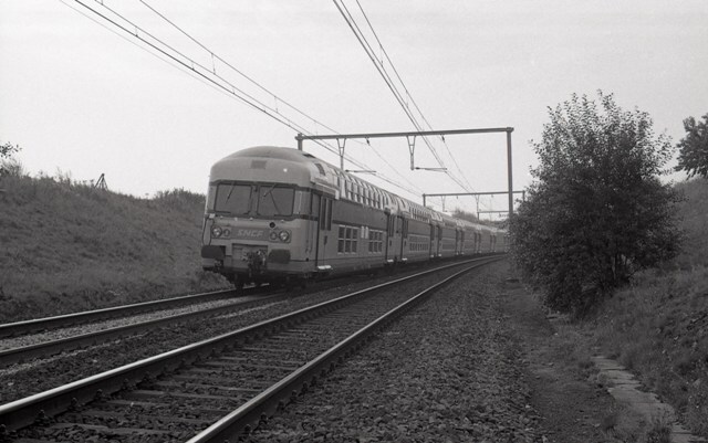 We zien de achterzijde van een internationale reizigerstrein. De sleep bestaat uit een pakwagen en dubbeldekrijtuigen van de SNCF. Het laatste rijtuig is uitgerust met een stuurpost.