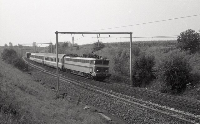 Elektrische locomotief 1803 rijdt met een internationale reizigerstrein in de omgeving van Cuesmes. Links van de sporen staat een lichtsein en liggen er losse houten dwarsliggers.
