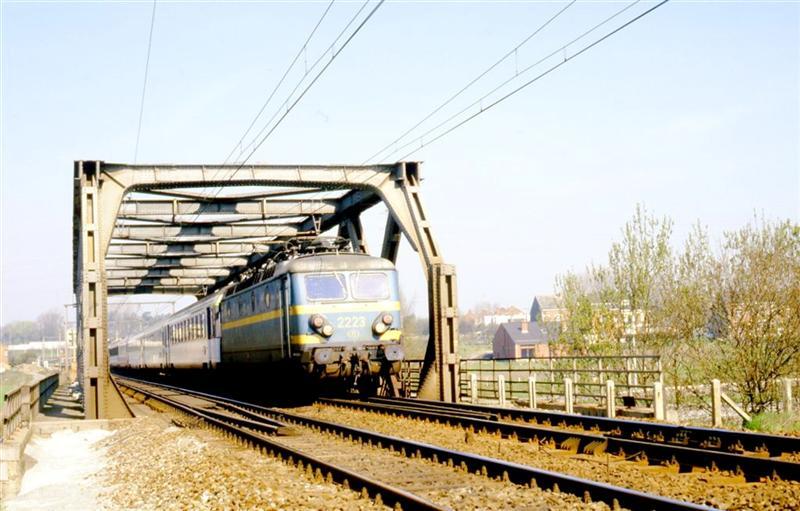 BeschrijvingWe zien een elektrische locomotief van de reeks 22 rijden over een metalen spoorbrug. De locomotief sleept een aantal rijtuigen van een internationale trein.
