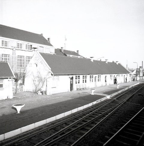 De foto toont de zij- en achtergevel van het station met zadeldak. Tegen de gevel staat een zitbank. Het perron is met bloemvazen verfraaid.