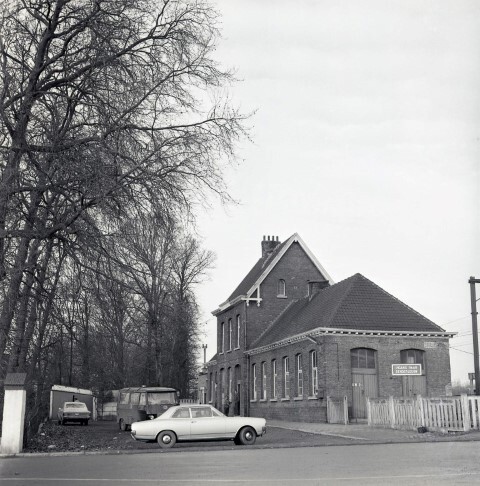 BeschrijvingDe foto toont de voor- en zijgevel van het station met puntdak. Voor het gebouw staan auto's geparkeerd. Een afsluiting bestaande uit betonnen elementen sluit het spoorwegdomein af.