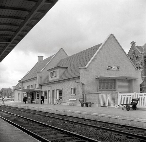 De foto toont de zij- en achtergevel van het station met luifel. Op het perron staan zitbanken en twee handwagens voor het vervoer van pakjes en post. De afsluiting van het spoorwegdomein bestaat uit betonnen elementen. Op de achtergrond steekt een reizigster de sporen gelijkgronds over.