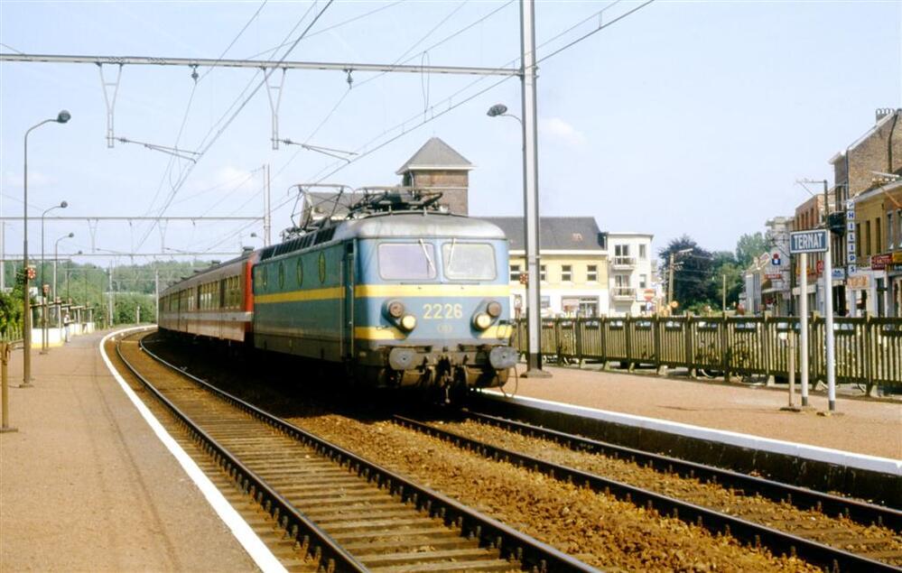 Een elektrische locomotief van de reeks 22 staat aan het perron in station Ternat. De locomotief sleept een reizigerstrein samengesteld uit M 4-rijtuigen. Op de achtergrond is het stationsgebouw te zien. Verder hebben we zicht op de perrons, de verlichting, een stationsnaambord en enkele schuilhuisjes. Schenking van Myriam Hendrickx.