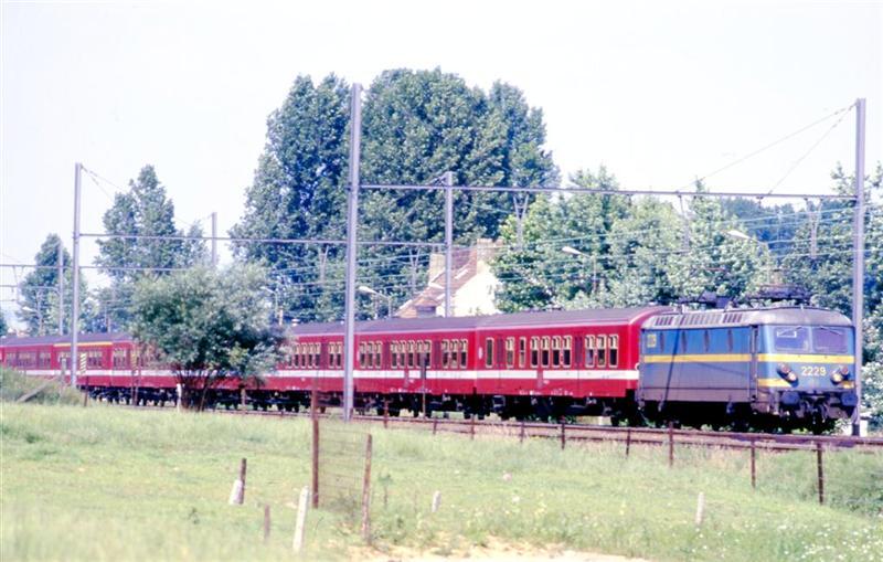 BeschrijvingEen elektrische locomotief van de reeks 22 rijdt op volle baan met een reizigerstrein samengesteld uit M 4- rijtuigen.