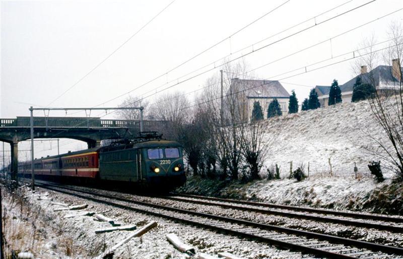 BeschrijvingEen elektrische locomotief van de reeks 22 rijdt op volle baan met een reizigerstrein bestaande uit M 4-rijtuigen. De trein is net onder een betonnen brug gereden.