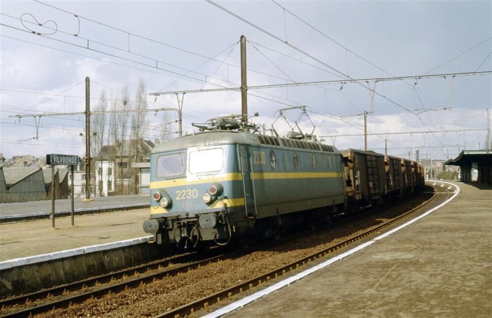 Een elektrische locomotief van de reeks 22 rijdt met een goederentrein door het station Vilvoorde. De perrons, overkapping en een stationsnaambord werden eveneens in beeld gebracht.