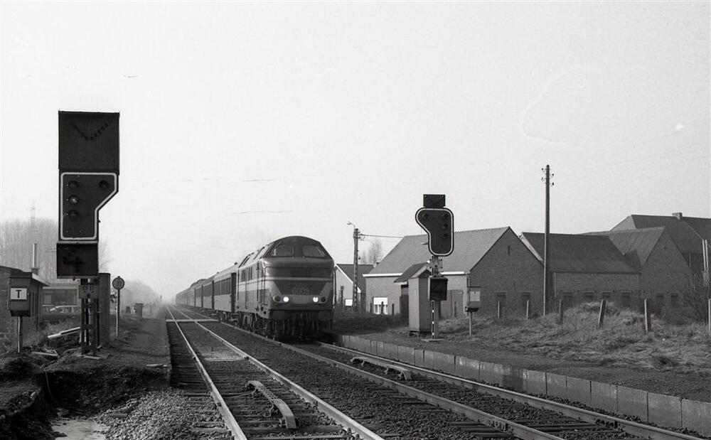 Deze locomotief behoort tot de reeks 60. Ze heeft enkele K 1-rijtuigen aan de haak. Links zien we een stopsein van het type III, rechts is een stopsein type II te zien. Tussen de rails van beide sporen liggen 'krokodillen', dit zijn veiligheidstoestellen die zich ter hoogte van een sein bevinden. Schenking van Myriam Hendrickx.