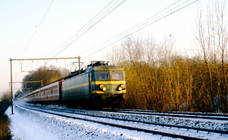 Een elektrische locomotief van de reeks 22 rijdt in winterse omstandigheden op spoorlijn 50. Ze sleept een reizigerstrein, samengesteld uit M 4-rijtuigen. Links op de achtergrond zien we nog het stationsgebouw.