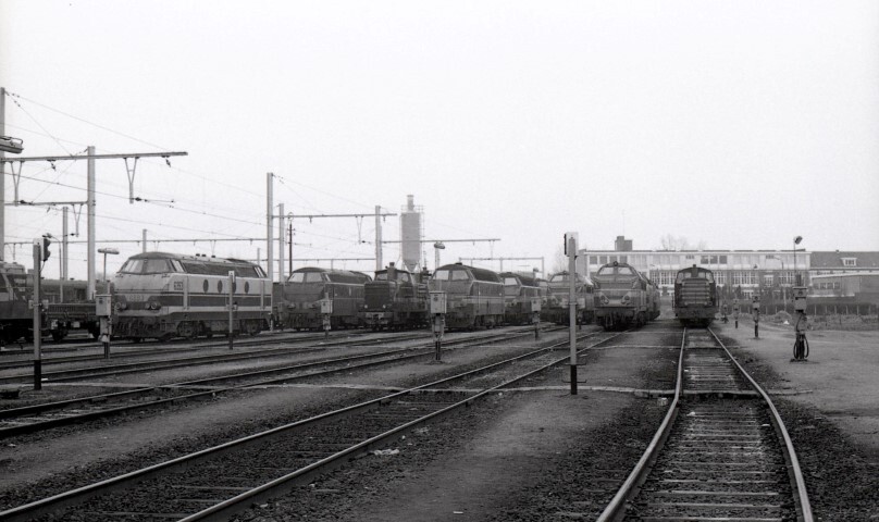 Deze foto toont de sporenbundel met verschillende reeksen diesellocomotieven. De toren in het midden van de foto is een bezandingsinstallatie. Hij bevoorraadt de locomotieven met fijn zand, dat wordt gebruikt om de adhesie tussen de wielen van de locomotief en de rails te vehogen bij ongunstige omstandigheden (fijne regen, uitvallende mist, vallen van de bladeren, steile hellingen, zware last). Dit zand wordt dan onder druk tussen de wielen van de locomotief en de rails gespoten. Schenking van Myriam Hendrickx.