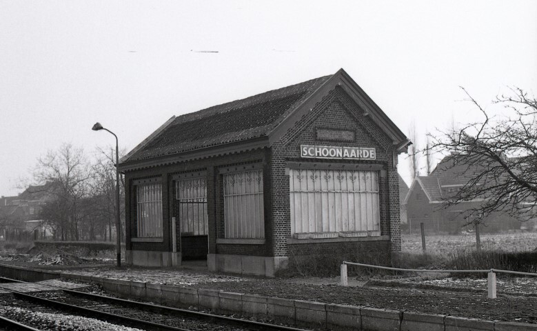 Dit stenen schuilhuisje met ramen in glas en smeedijzer, staat op het perron van het station Schoonaarde. Bemerk het stationsnaamsbord op de zijgevel. Om de sporen te kruisen moeten de reizigers onder begeleiding van spoorwegpersoneel de gelijkgrondse overgang gebruiken. Schenking van Myriam Hendrickx.