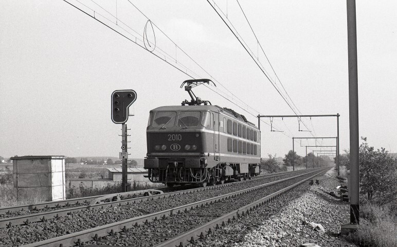 BeschrijvingElektrische locomotief 2010 rijdt als losse locomotief voorbij Erps-Kwerps. Links zien we een lichtsein en daarnaast tussen de rails een 'krokodil'.