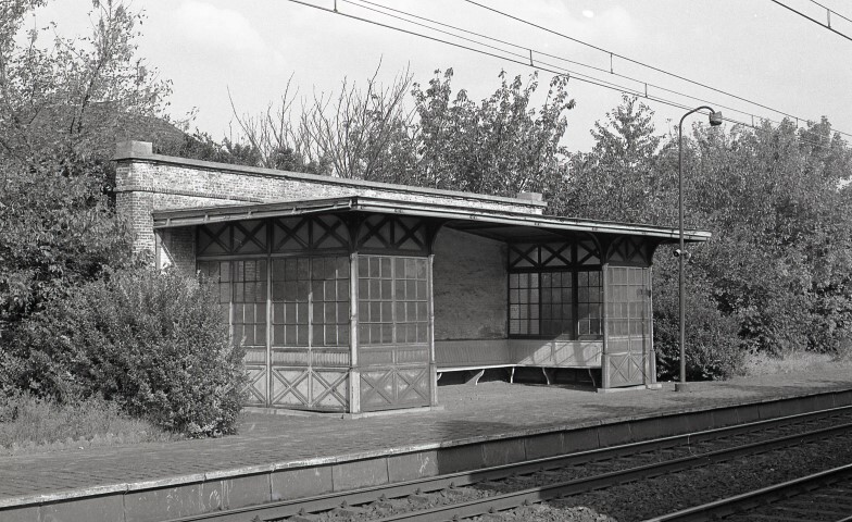 Deze foto toont een overdekt schuilhuisje met houten zitbanken op het perron in station Veltem. Daarnaast staat een lantaarnpaal waarop twee luidsprekers zijn bevestigd. Via deze luidsprekers wordt vanop afstand informatie over het treinverkeer gegeven aan de reizigers. Schenking van Myriam Hendrickx.