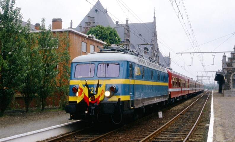Een elektrische locomotief reeks 22 komt met een reizigerstrein aan in het station. De trein is samengesteld uit M 4-rijtuigen. De locomotief is versierd met vlaggen ter gelegenheid van de elektrificatie van spoorlijn 108 Erquelinnes – Haine-Saint-Pierre tussen Binche en Haine-Saint-Pierre. Op de achtergrond zien we het stationsgebouw. Schenking van Myriam Hendrickx.