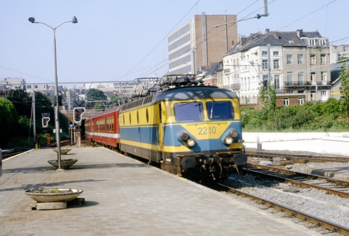 Een elektrische locomotief reeks 22 staat aan het perron met een reizigerstrein samengesteld uit M 4-rijtuigen. We hebben zicht op het perron, de verlichting en enkele bloembakken. Op de achtergrond zijn twee lichtseinen te zien. Schenking van Myriam Hendrickx.