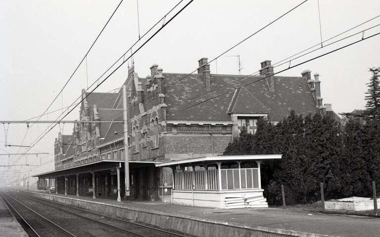 Deze foto toont de zij- en achtergevel van het station Essen. Het was een grensstation, vandaar het grote gebouw voor een relatief kleine gemeente. Bemerk ook de aangebouwde luifel over het perron. Rechts zien we op het perron een overkapping waaronder trappen naar de onderdoorgang leiden. Schenking van Myriam Hendrickx.