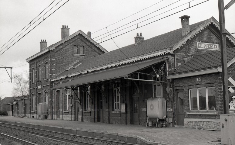 Deze foto toont de zij- en achtergevel van het station. Op de zijgevel hangt een stationsnaambord. Uiterst rechts zien we 'Blokpost 5' (B.5). Een blokpost bedient de seinen en de wissels in een station. Bemerk ook de aangebouwde luifel aan de achterzijde van het gebouw. Schenking van Myriam Hendrickx.