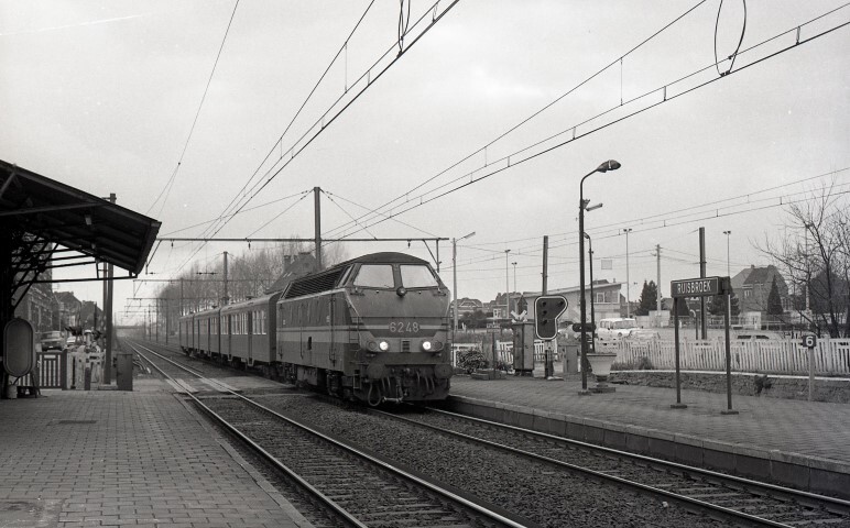 Deze locomotief behoort tot de reeks 62. Ze heeft M 2-rijtuigen aan de haak. Links zien we nog net de aangebouwde luifel over perron 1. Rechts op perron 2 bemerken we een stationsnaambord en een lichtsein.