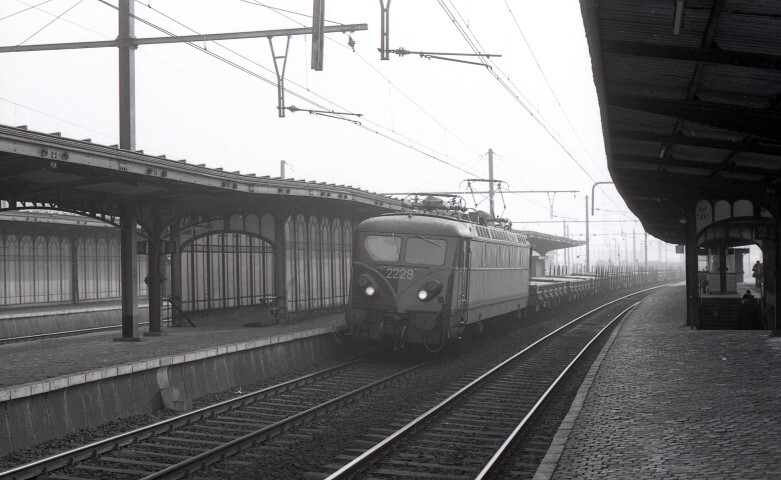 Deze locomotief behoort tot de reeks 22. Ze heeft een goederentrein bestaande uit platte wagens met rongen aan de haak. Links en rechts van de trein zien we de perrons van het station met hun klassieke luifels en bestraat met kasseien. Schenking van Myriam Hendrickx.
