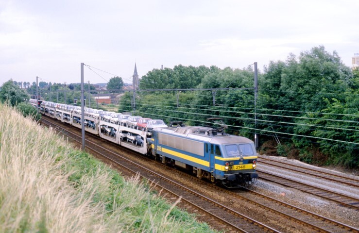 BeschrijvingEen elektrische locomotief van de reeks 21 sleept een goederentrein met auto's op volle baan. Links op de achtergrond staat een lichtsein.
