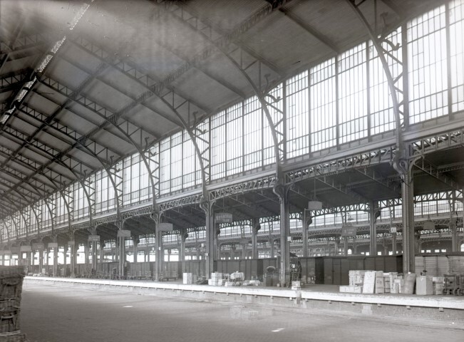 Deze fotogroep bestaat uit vijf glasplaten. Ze tonen de overkapte binnenzijde van het goederenstation. De overkapping is opgetrokken in staal en glas. Op de perrons staan goederen opgeslagen. Vanuit gesloten goederenwagens worden ze op vrachtwagens overgeladen.