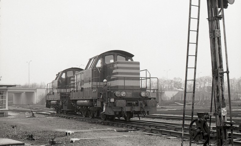 Deze locomotieven behoren tot de reeks 73. Op de voettrede van de voorste locomotief zien we een rangeerder. Uit het raam van de achterste locomotief kijkt de bestuurder naar de rangeerder, wachtend op bevelen van hem. Rechts zien we een seinmast en het bedieningsmechanisme van een mechanisch sein. Schenking van Myriam Hendrickx.