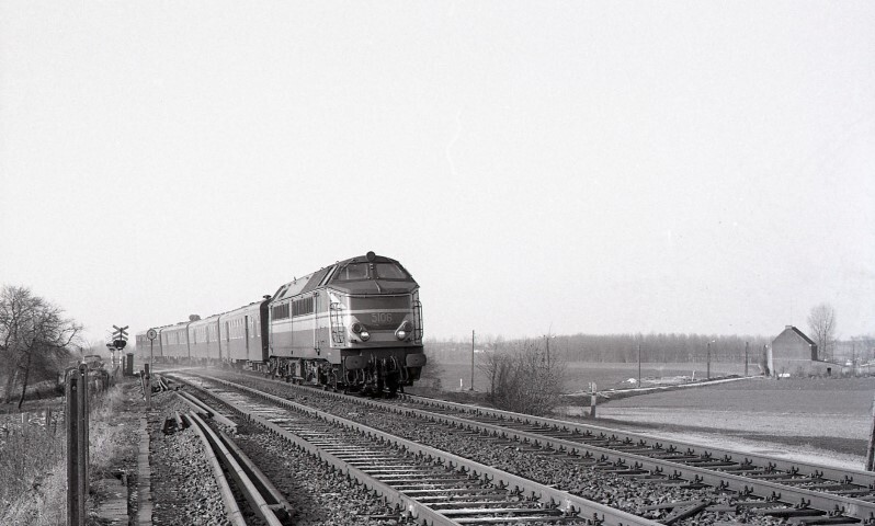 Locomotive diesel 5106 tracte une rame de quatre voitures M 2 sur la ligne 94. Au moment de la photo, cette ligne n’est pas encore électrifiée. Le train passe à hauteur d’un passage à niveau protégé par des croix de Saint-André et des feux. Quelques traverses éparses se trouvent le long des voies. Don de Myriam Hendrickx.