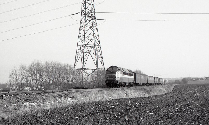 BeschrijvingDiesellocomotief 5141 rijdt met een sleep van vier M 2-rijtuigen op spoorlijn 94. Deze lijn is op het moment van de opname nog niet geëlektrificeerd.