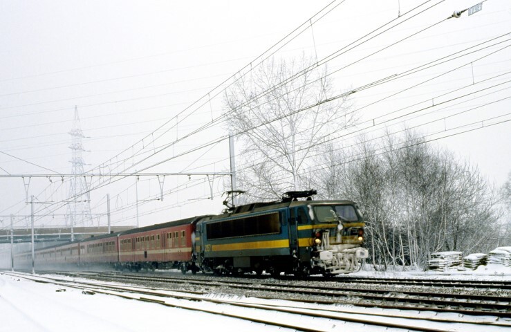 BeschrijvingElektrische locomotief 2157 (reeks 21) sleept een reizigerstrein samengesteld uit M 4-rijtuigen. De trein rijdt op volle baan door een winters landschap.