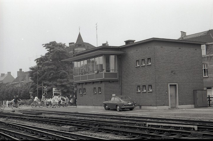 BeschrijvingDeze fotogroep bestaat uit twee negatieven. Ze tonen de seinpost en overweg aan het station Deinze-Petegem. De overweg staat open en voetgangers, fietsers en auto's kruisen de sporen.