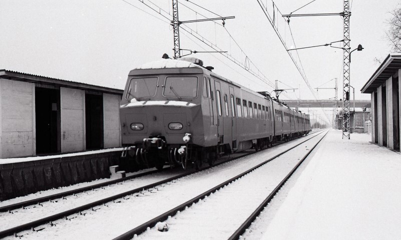 Vierledig motorstel 833 staat aan een besneeuwd perron in station Buda. Op de perrons staan schuilhuisjes in beton. Station Buda ligt langs spoorlijn 25 (Brussel - Antwerpen).