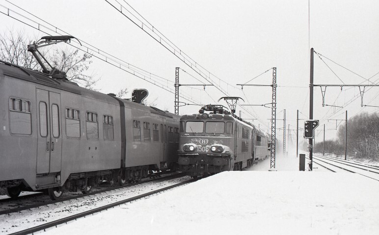 Elektrische locomotief 1505 rijdt met een internationale reizigerstrein (TEE Île de France) voorbij station Eppegem. Op het spoor ernaast rijdt een vierledig motorstel van de reeks 08. Rechts op het perron staat een lichtsein. Station Eppegem ligt langs spoorlijn 25 (Brussel - Antwerpen). Schenking van Myriam Hendrickx.