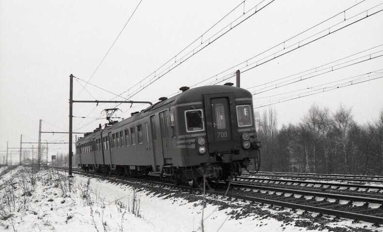 BeschrijvingTweeledig motorstel 709 rijdt voorbij Duffel. Dit stel behoort tot de reeks 06, schijf 1974.