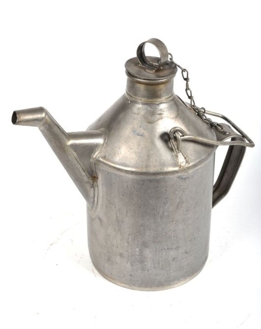 BeschrijvingDe kan heeft een dekseltje dat eraan vast hangt met een ketting. Het heeft een handvat achteraan en één bovenaan.