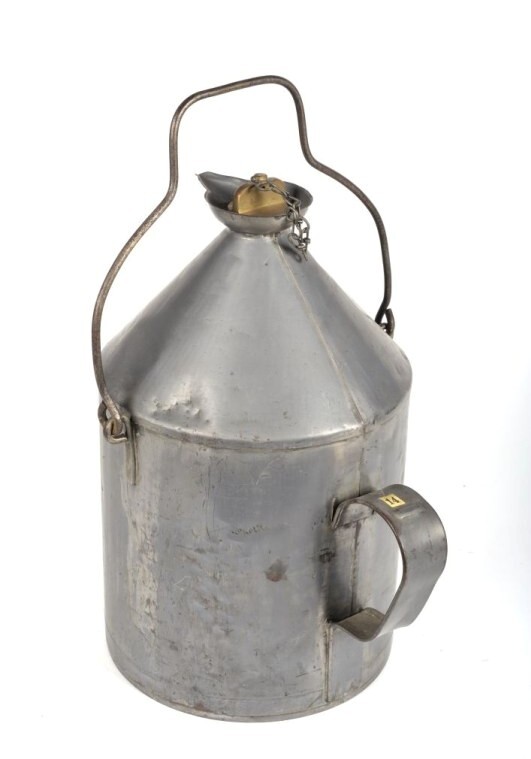 BeschrijvingDe kan heeft een klein draaidopje dat eraan vast hangt met een ketting. Het heeft een handvat achteraan en één bovenaan. Vooraan hangt een metalen plaatje waarop '10 L' staat. De tuit is zeer klein.