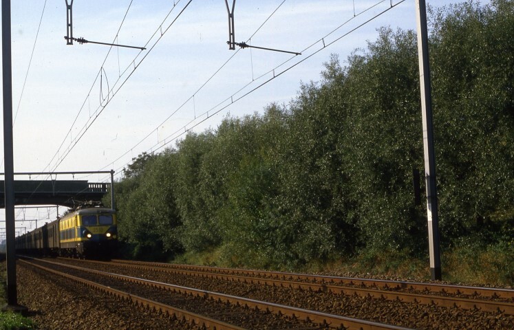 BeschrijvingElektrische locomotief 2513 rijdt met een reizigerstrein onder een brug door in de omgeving van Ternat.