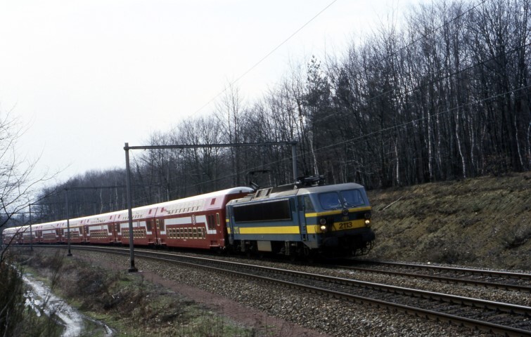 Deze fotogroep bevat twee dia's. Het eerste beeld toont een reizigerstrein samengesteld uit M 5-rijtuigen en gesleept door een elektrische locomotief reeks 21. De volgende foto laat de achterzijde van de trein zien, met achteraan een M 5-rijtuig met stuurpost. Op de voorgrond is een kilometerpaal zichtbaar langs het spoor. Schenking van Myriam Hendrickx.
