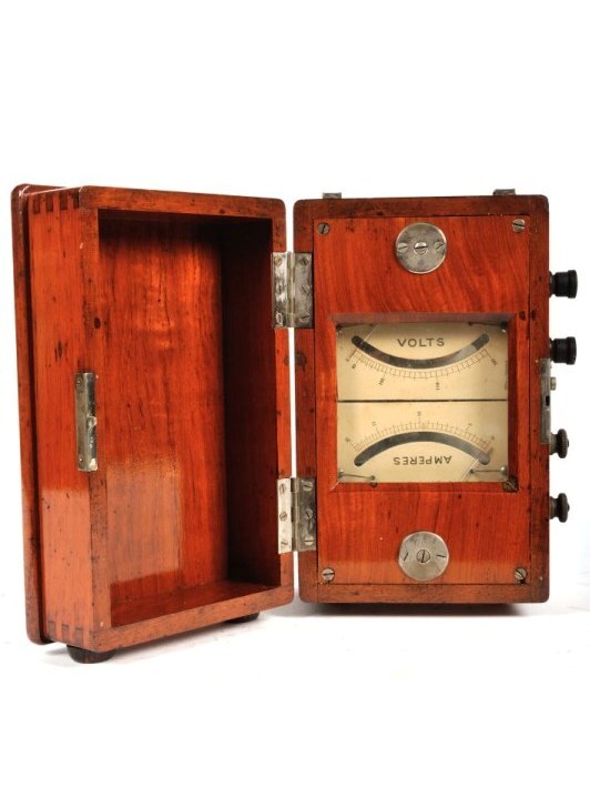 De ampère- en voltmeter zijn instrumenten om elektrische stroom te meten. Deze draagbare meter werd gebruikt door de dienst Elektriciteit en Seininrichting. Het houten kistje heeft vier pootjes onderaan en vier pootjes aan de linkerzijde. Vooraan zijn vier draaiknoppen en een slotje om het kistje open te maken. Binnenin zijn twee wijzerplaten te zien, de ene kan elektrische stroom tot 20 ampère meten en de andere elektrische spanning tot 200 volt.