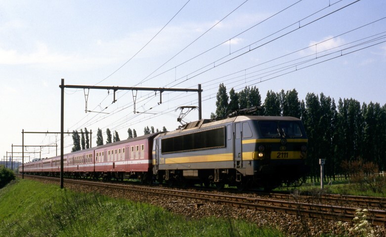 Deze fotogroep bevat twee dia's. Ze tonen een reizigerstrein samengesteld uit M 4-rijtuigen en gesleept door een elektrische locomotief reeks 21. Op de eerste foto zien we de voorzijde van de trein, met locomotief 2111. Op de tweede foto is de achterkant van de trein te zien, met een rijtuig met stuurpost. Rechts van de locomotief zien we enkele kilometerpalen en een seinbaken. Schenking van Myriam Hendrickx.