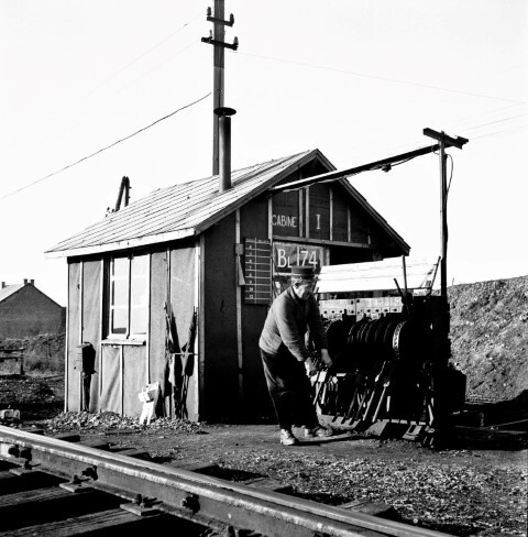 BeschrijvingDe foto toont de voorlopige seinpost Bl.74. De seingever haalt de handel van een seingestel Siemens over om een sein of wissel te bedienen. Tegen de keet staan seinvlaggen en twee stopblokken opgesteld.