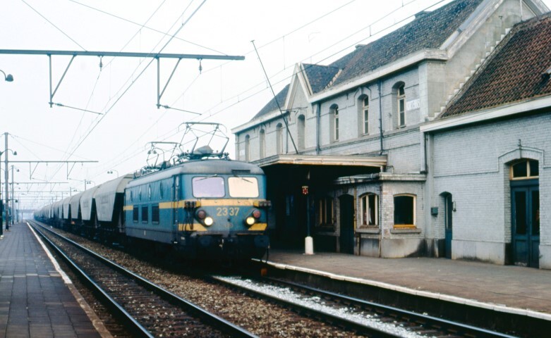 Elektrische locomotief 2337 rijdt met een goederentrein voorbij station Kortenberg. We zien duidelijk de achtergevel van het stationsgebouw. Kortenberg ligt op spoorlijn 36 (Brussel - Leuven - Luik-Guillemins).