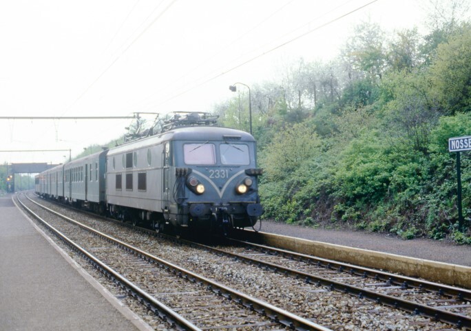Elektrische locomotief 2331 komt met een sleep M 2-rijtuigen aan in station Nossegem. Op het perron staat een stationsnaambord. Dit station ligt langs de lijn 36 (Brussel-Noord - Leuven - Luik-Guillemins).