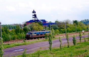 BeschrijvingElektrische locomotief 2333 rijdt als losse locomotief voorbij Bois-du-Luc. Op de achtergrond zien we de schachtbok van de mijnsite Bois-du-Luc.