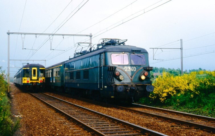 Elektrische locomotief 2340 sleept een reizigerstrein bestaande uit M 2-rijtuigen. De trein rijdt voorbij tweeledig motorstel 508 op het andere spoor. Dit motorstel behoort tot reeks 00, schijf 1955.