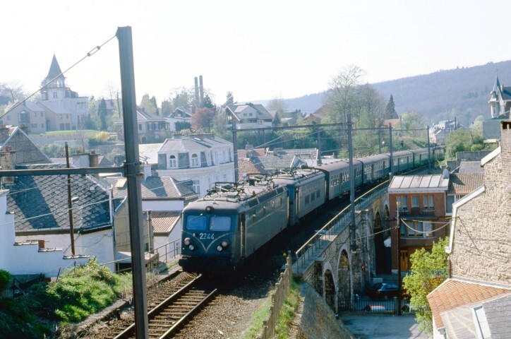 Deze fotogroep bevat twee dia's. Elektrische locomotieven 2244 en een tweede rijden met een excursietrein voor de vereniging TSP-PFT door Spa-Géronstère. De trein bestaat uit M 2-rijtuigen en rijdt net over een spoorwegbrug heen. Schenking van Myriam Hendrickx.