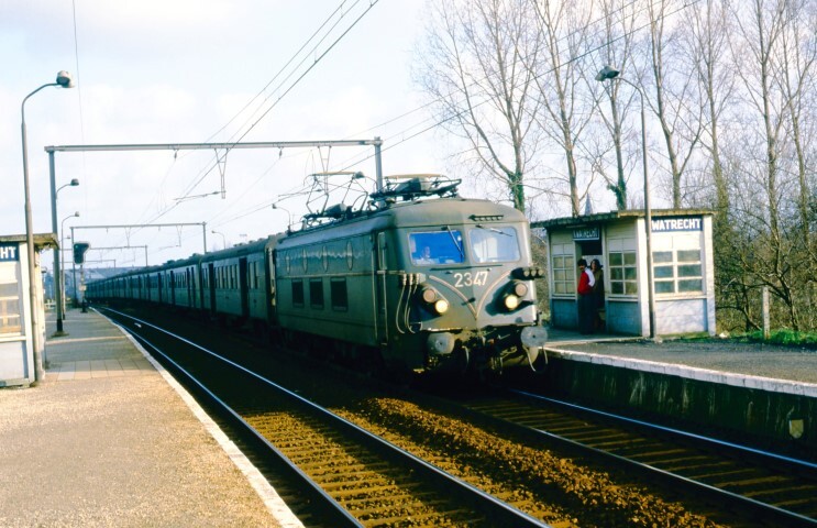 Deze fotogroep bevat twee dia's. Elektrische locomotief 2347 komt aan met een lange sleep M 1-rijtuigen in de stopplaats Kwatrecht. Op de perrons staan lantaarnpalen, schuilhuisjes met naambord en een lichtsein. Deze stopplaats ligt aan spoorlijn 50 (Gent-Sint-Pieters - Brussel-Noord). Schenking van Myriam Hendrickx.